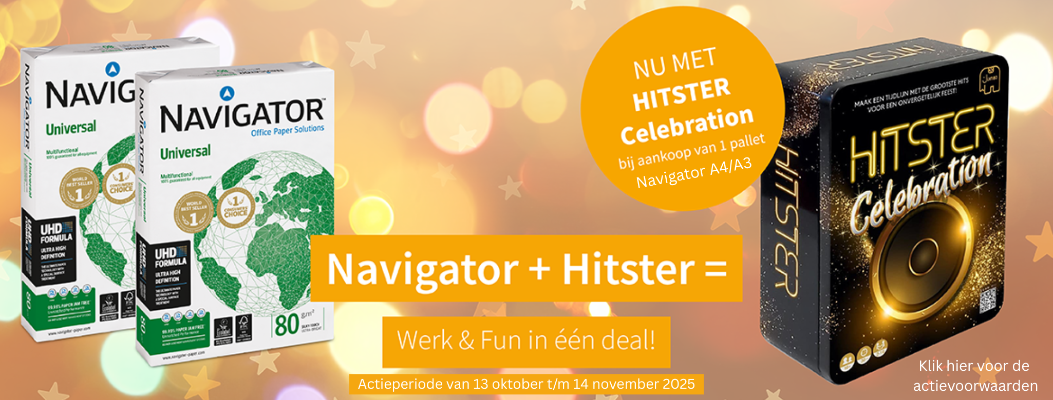Tijdens de actieperiode van 13 oktober t/m 14 november 2025 ontvang je bij aankoop van één pallet Navigator A4/A3 papier het populaire spel Hitster Celebrations. Een perfecte kans om niet alleen je voorraad A-kwaliteit papier aan te vullen, maar ook om samen met collega’s, vrienden of familie te genieten van een feestelijk muziekspel vol herkenbare hits.Hitster Celebration is dé ultieme feesteditie met meer dan 300 zorgvuldig geselecteerde nummers, waaronder 70 populaire “fan picks”. Deze exclusieve tinnen doos met houten tokens zorgt voor eindeloos feestplezier. Plaats de nummers in de juiste volgorde en combineer met andere Hitster-edities voor nóg meer variatie. De perfecte playlist voor elk feest! Mis deze kans niet – de actie geldt zolang de voorraad strekt!